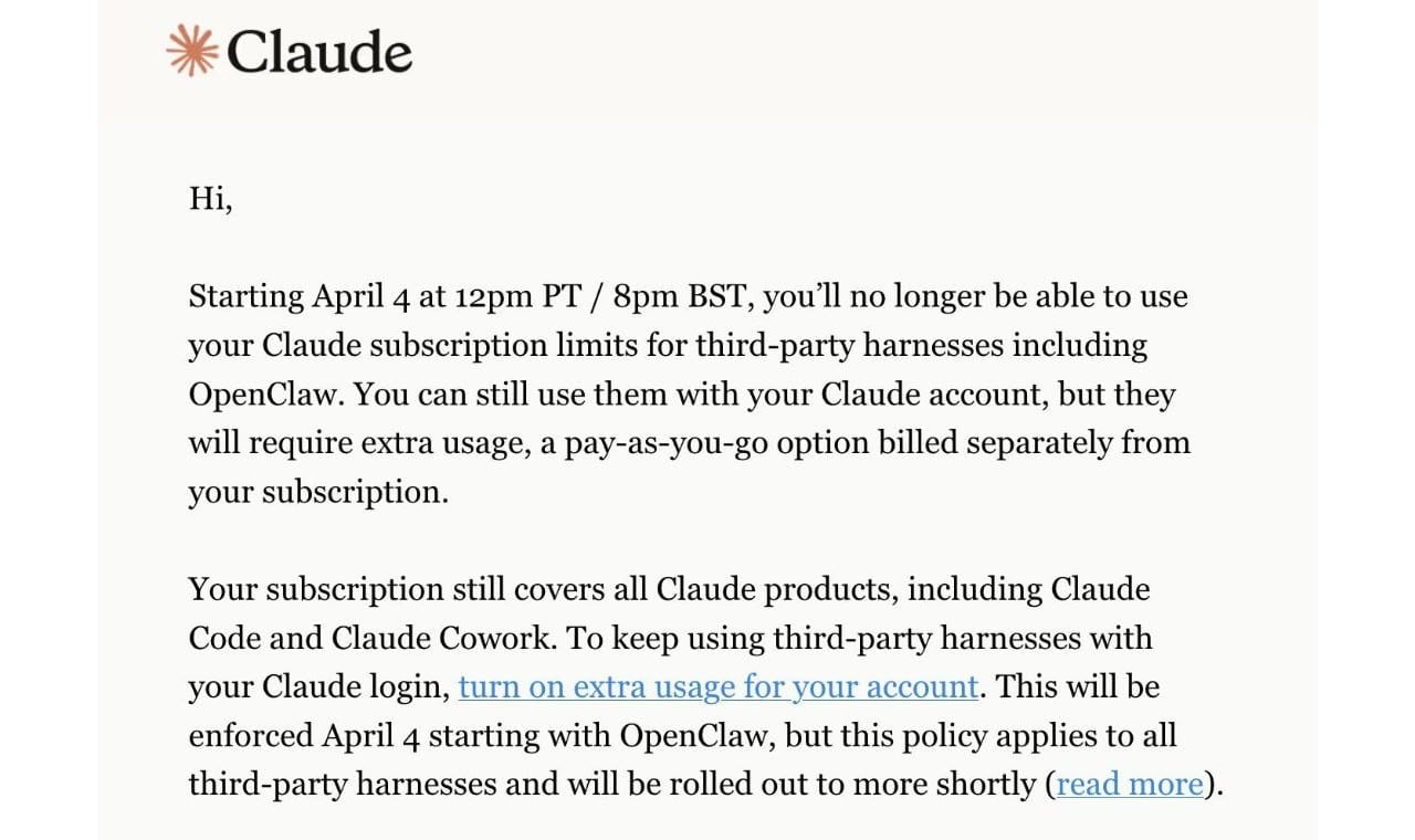 Starting today, apps like OpenClaw can't tap into your subscription anymore you'll have to pay per token or buy usage bundles instead.